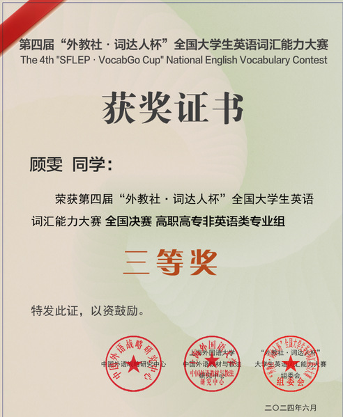 5月25日晚,经过前期校赛和省赛的角逐,我校顾雯、杨启明和刘雨三名同学代表我校,在敏行楼407参加第4届“外教社·词达人杯”全国大学生英语词汇能力大赛国赛。其中公共教学部英语教研室潘敏老师指导的23级金融服务与管理2班顾雯同学在国赛中脱颖而出,荣获国赛三等奖。